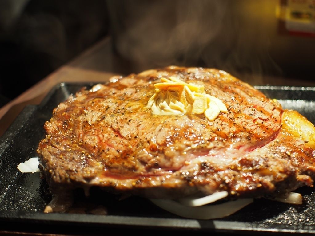 鉄板からはみ出そうなほどのステーキは炭火でこんがりと焼かれていまして、このビジュアルは肉好きにとっても堪らないものであります