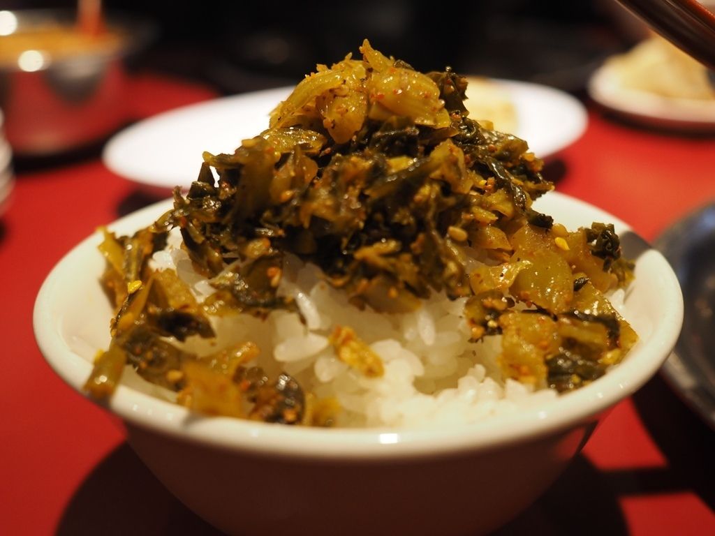 替玉も用意されているのですが、先に自家製だと言う中太麺と一緒にスープを半分ほどいただいてしまいましたので、お店の一角に用意される無料取り放題の辛子高菜が用意されていますので高菜ライスを…
