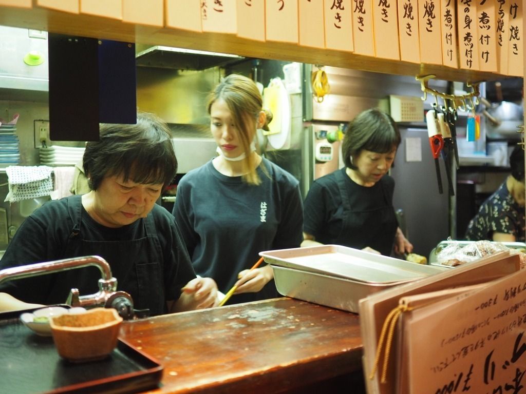 お昼の営業では姿を見かけることが多い大将ですが、夜は翌日の仕入れのためにいないのか、お嬢さま4人で切り盛りしていらっしゃいますね