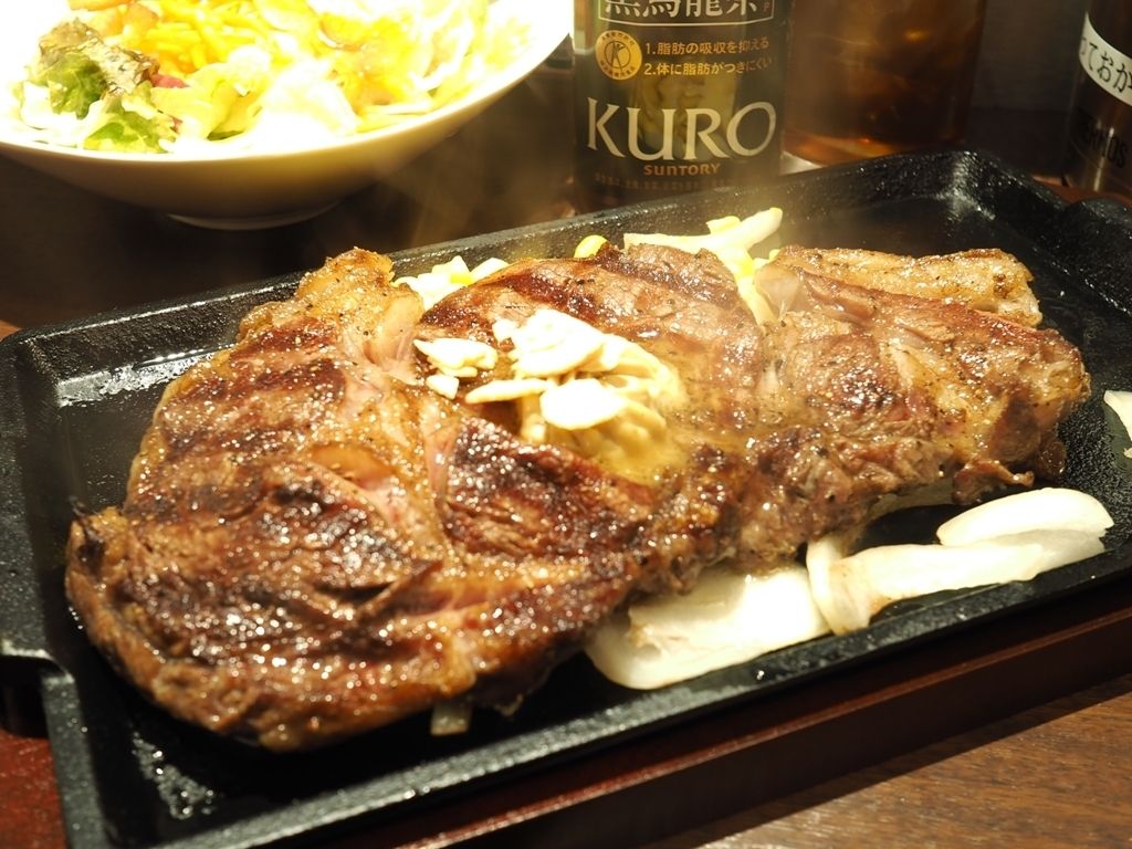 こちらでいただくステーキは表面が強火でこんがりと焼かれていながらも中はレアなジューシー感を味わえるものでありまして…