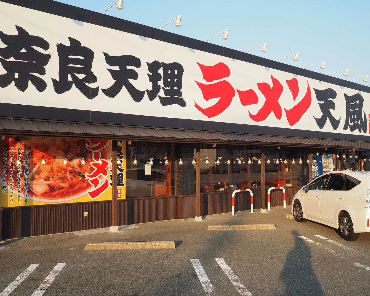 それほど大きな交差点ではありませんが信号がある交差点でもありますし駐車場の間口も100mほどある好立地であるだけでなく、インパクトある大きな看板が目立つ『奈良天理ラーメン天風』ってお店