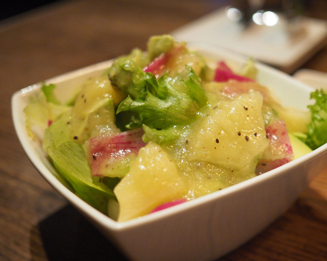 レタスの上に乗せられるアポカドとパイナップルにフルーツドレッシングが掛けられるというシンプルなものではありますが、パイナップルが持つ消化酵素がヘルシーな印象を与えてくれます
