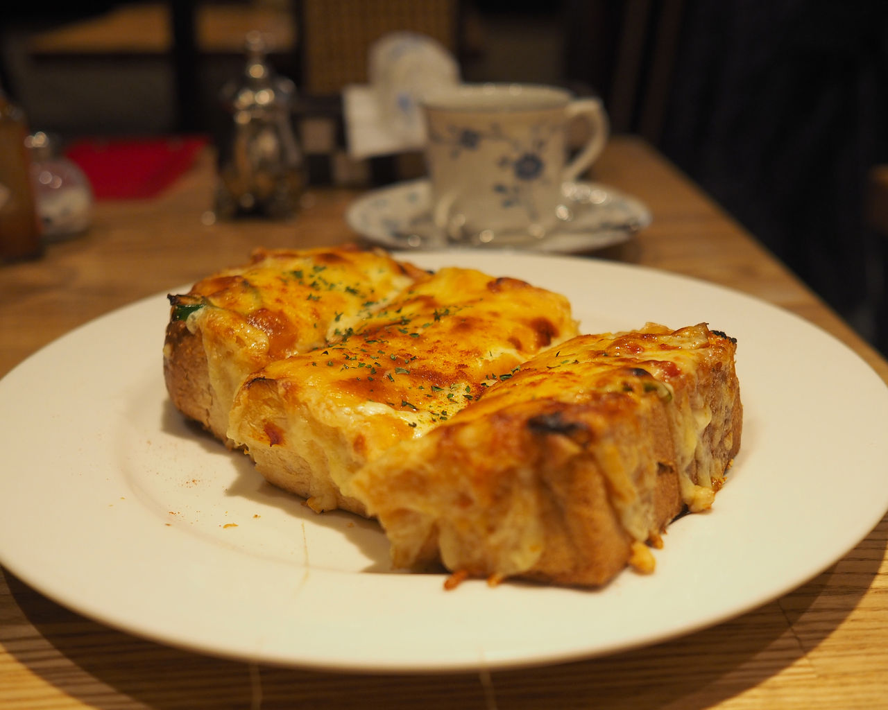 四つ切りにされた厚みがあるトーストにたっぷりのチーズが乗せられて、パンの耳から垂れるチーズに贅沢感を感じます