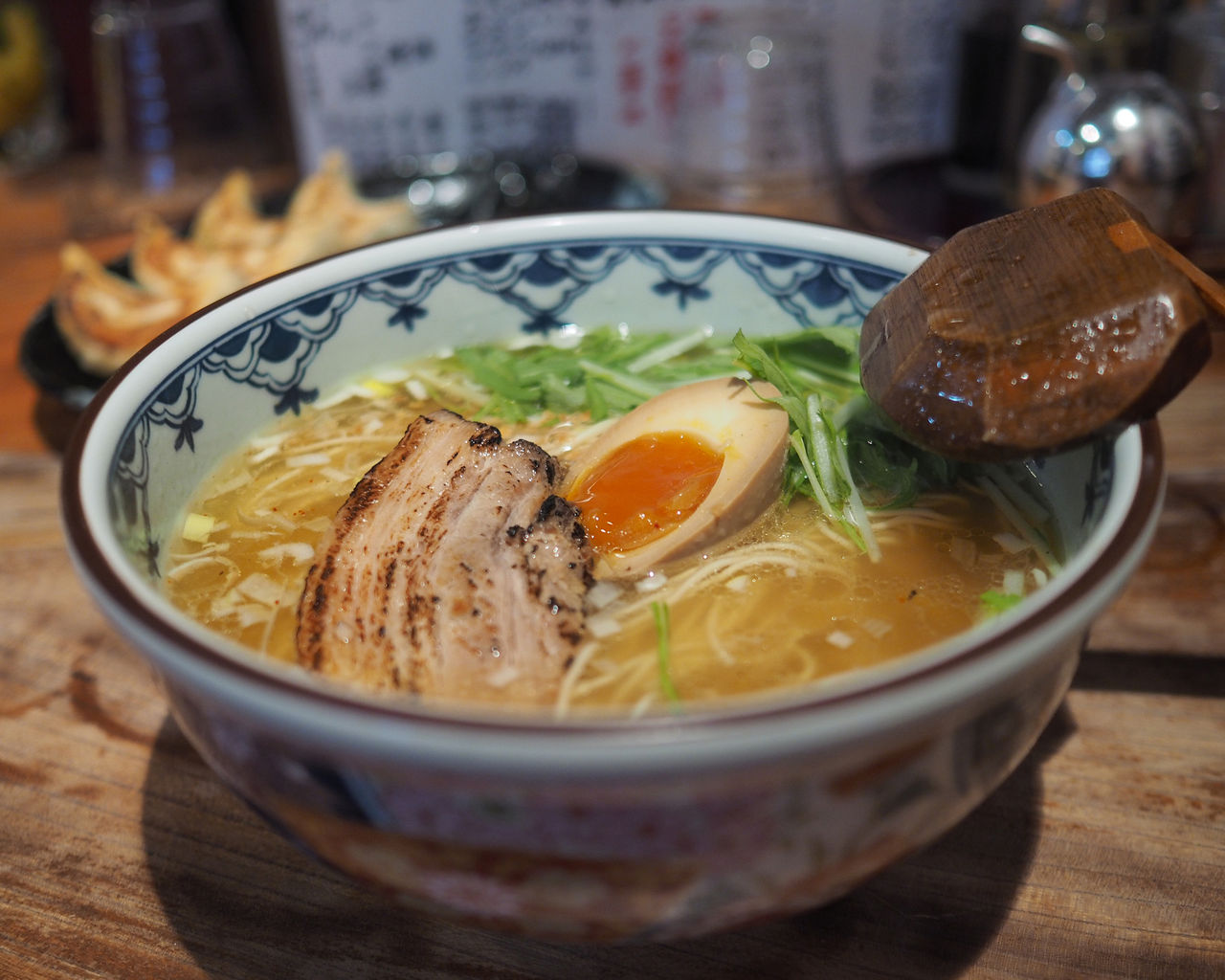 10人ほどが座れる分厚い板でつくられたカウンター席と、その背には4名掛けのテーブルふたつと2名掛けのテーブルがひとつというラーメン店としては程よい規模のお店でありまして…