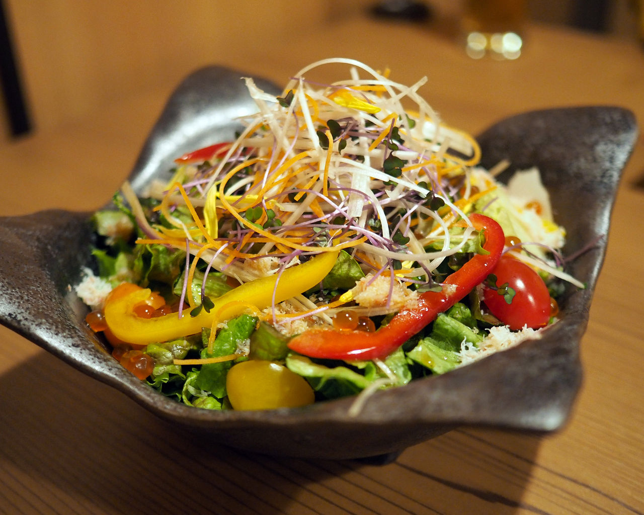 続いて提供されたサラダには蟹やいくらといった贅沢食材が使われていまして…