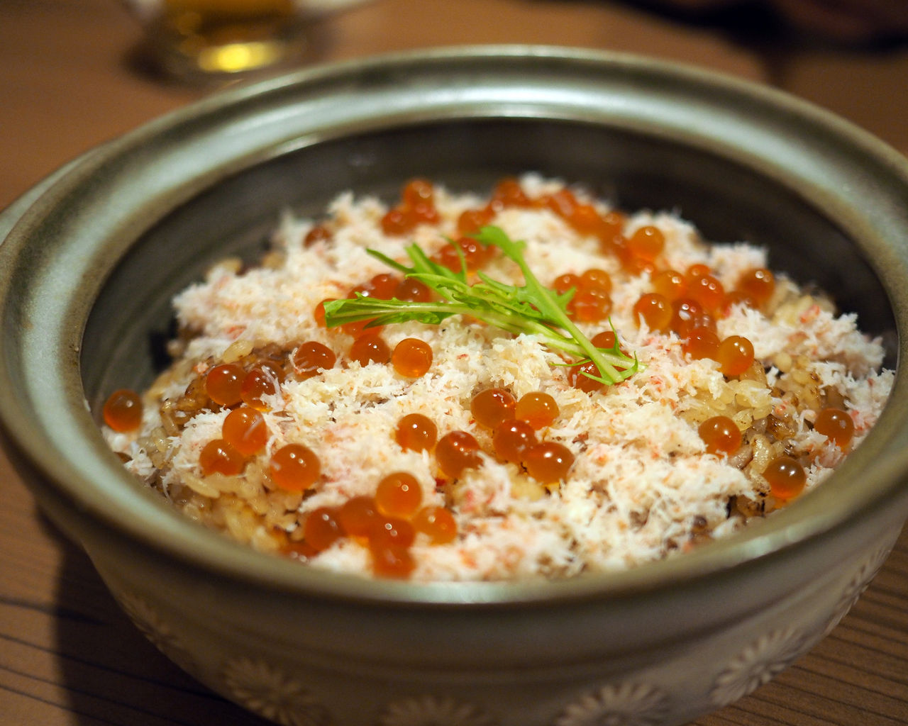 土鍋で炊き上げられた「蟹といくらの海鮮飯」