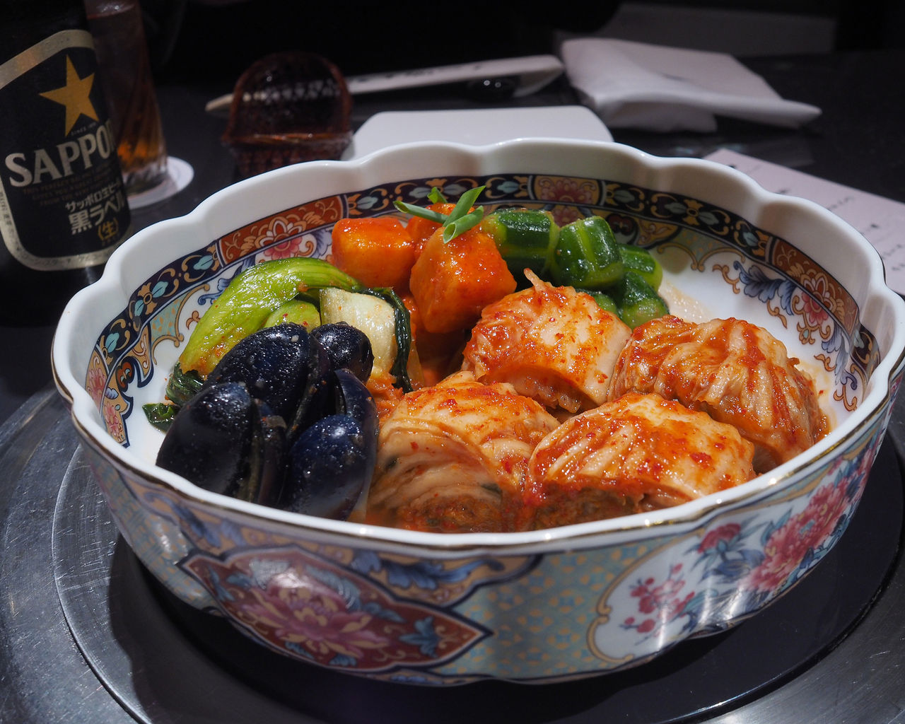 定番の白菜やキュウリ、大根と言ったキムチに加え、季節のキムチと言うことで添えられたのはチンゲン菜とナスでありまして…