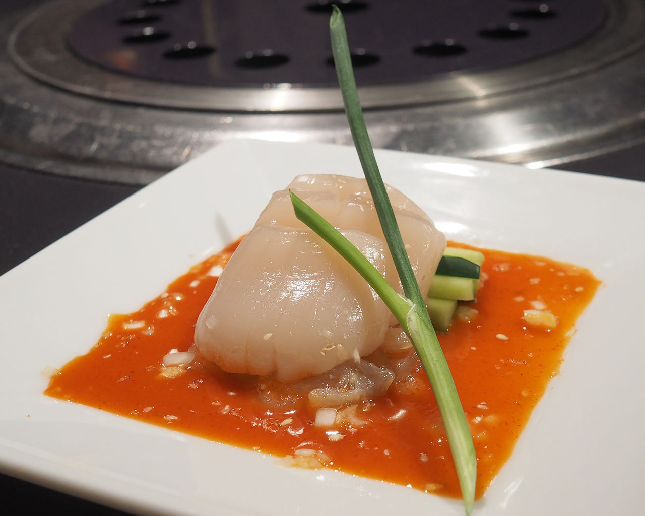 お皿に敷かれた“チョジャン”の上に飾られるのは身が厚い貝柱の刺身なのですが、これほどまでに大粒で甘味がある貝柱は和食のお店でも滅多にいただけないモノであります
