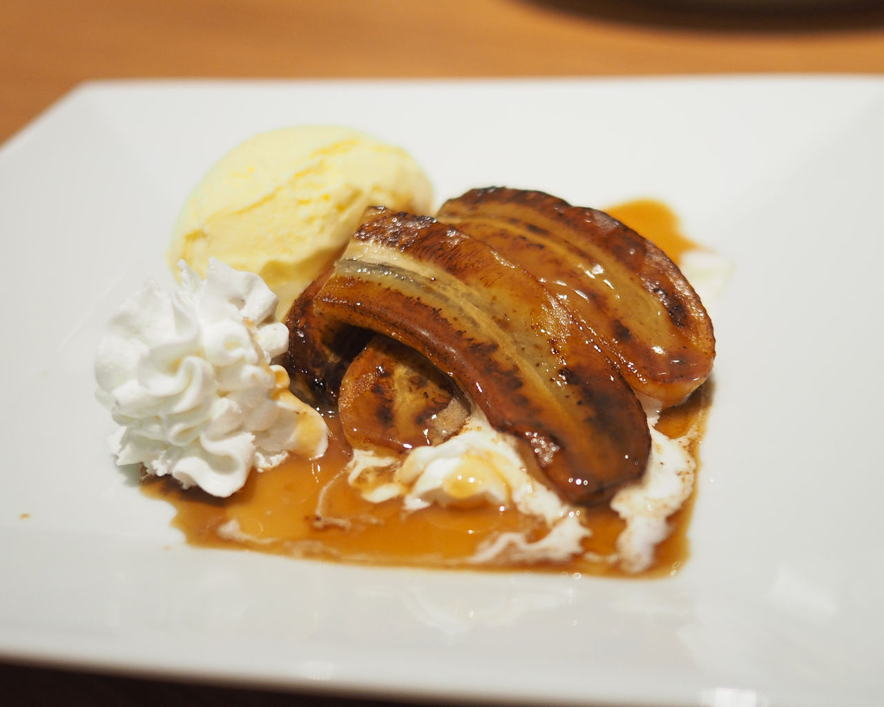 赤ワインで煮込まれた洋梨のコンポートも、注文が入ってから焼かれるバナナの甘みも期待以上に満足することができます