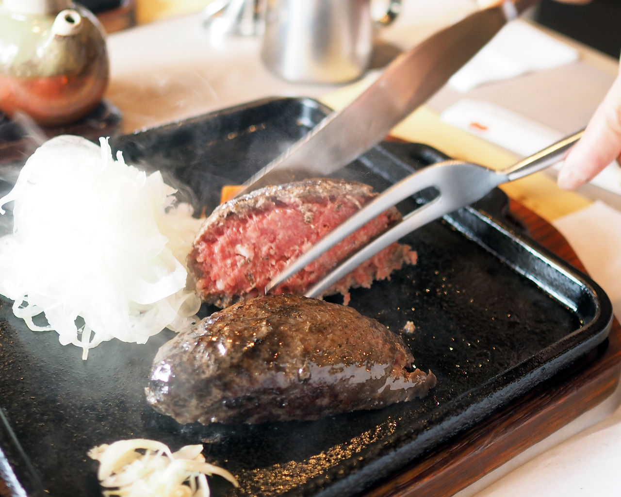 半分にカットされた俵型のハンバーグは、熱々に焼かれた鉄板で自分好みの焼加減でいただくことができるのであります
