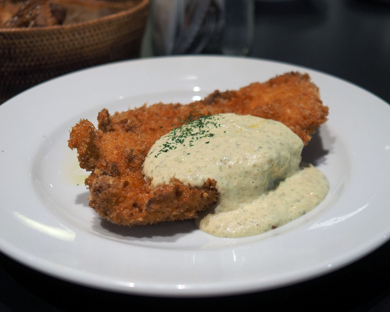 サクッと揚がった衣に包まれる胸肉がとってもふっくらとしていて、それだけでも十分においしくいただけるのですが、たっぷりと掛けられたタルタルソースが実においしくて…