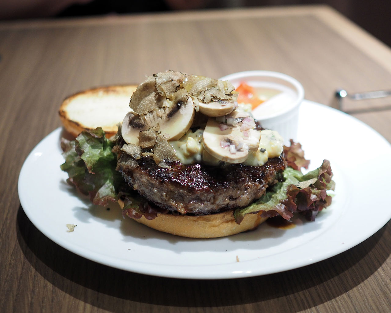 パティにはお肉をギュッと噛みしめる食感がありますし、トリュフの香りやフレッシュなマッシュルームの素朴な味わいが加わることでの完成形は見事なものでありました