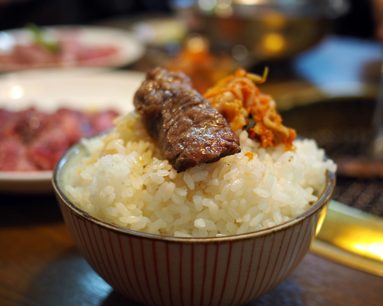 美しいサシが入った上等なものではないけども、しっとりとした滑らかな舌触りがある上質なお肉を甘めのタレでしっかりと揉み込んで…