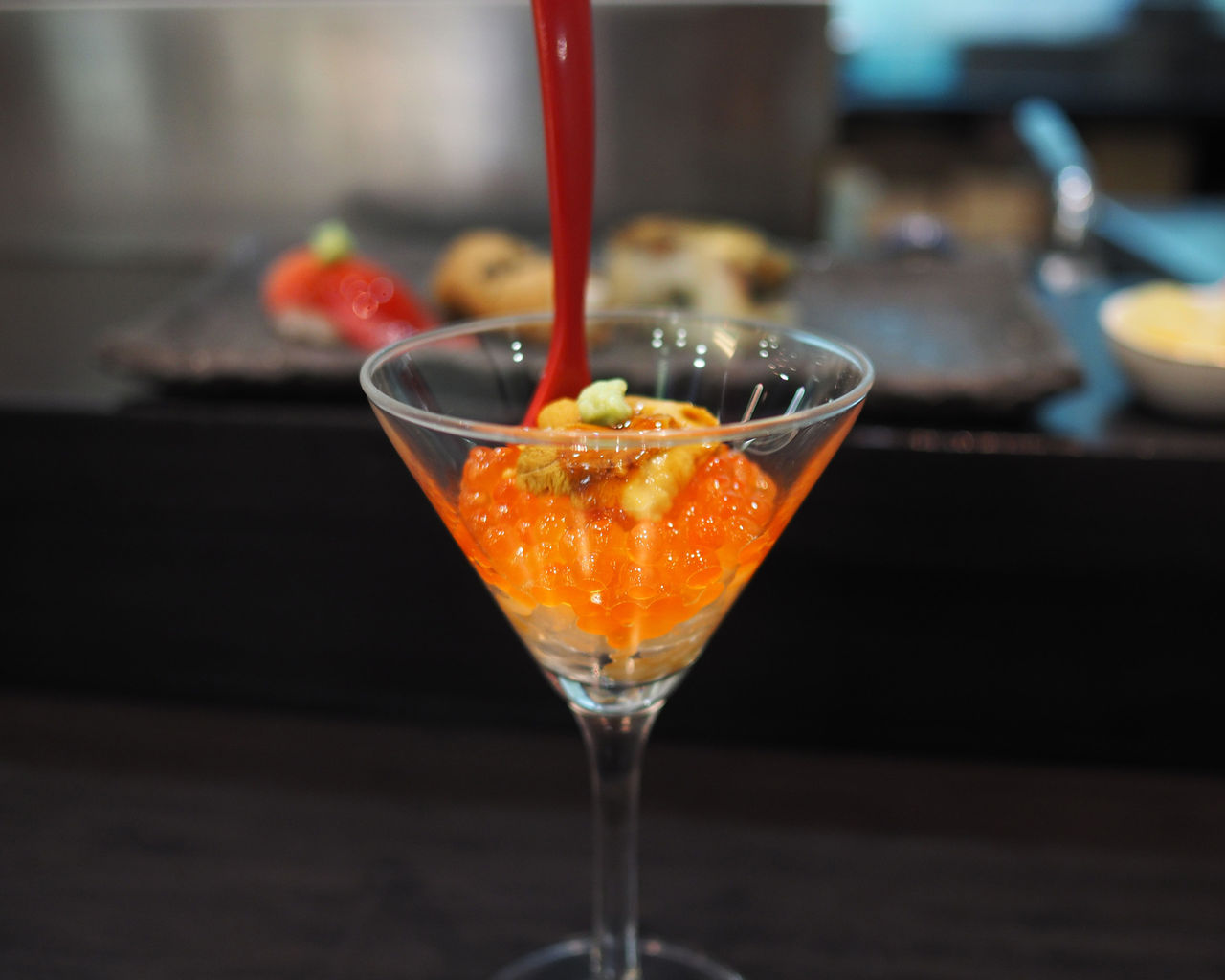 これをお寿司と呼ぶかどうかはさておいて、カクテルグラスを器として使ったこのお料理はインスタ映えすること間違いなしであります