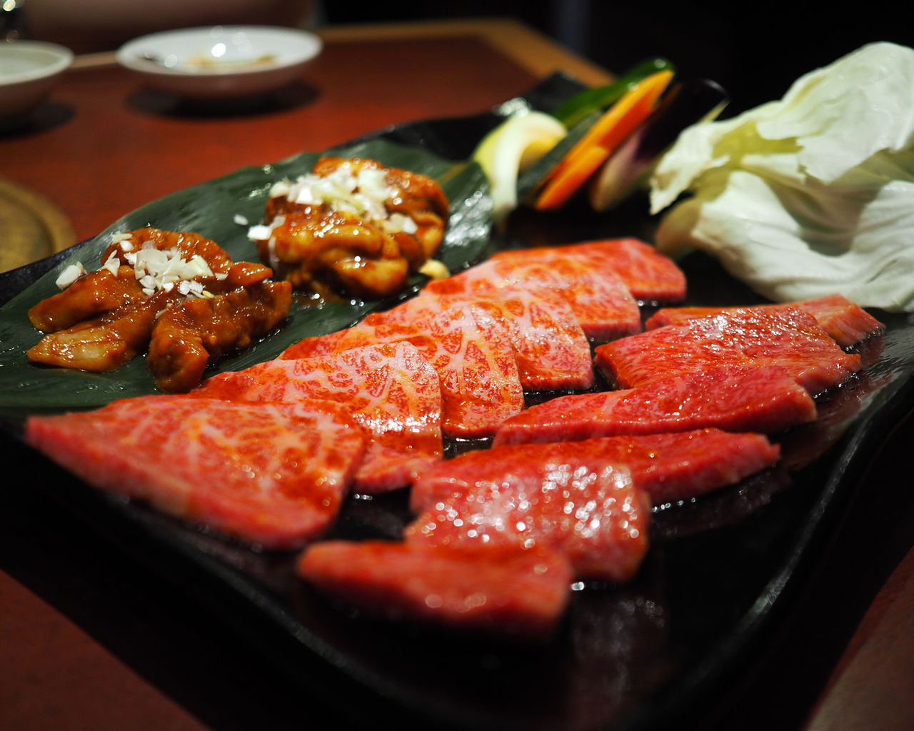 タレものとして提供されるのは上カルビ・上ロース・ホルモン・上ミノの4種でありまして、上質なお肉の証でもあるしっとりとした滑らかな舌触りを楽しみます