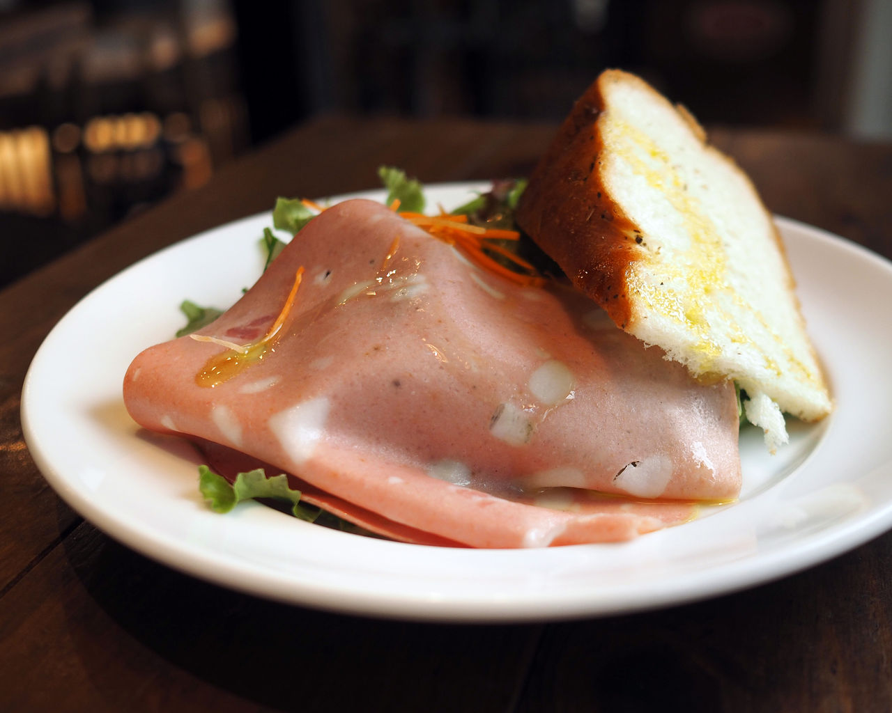 たっぷり野菜に上に大きなモルタデッラ乗っていまして、それを程よい大きさに切り分けながら酸味が効いたドレッシングとともにいただきます