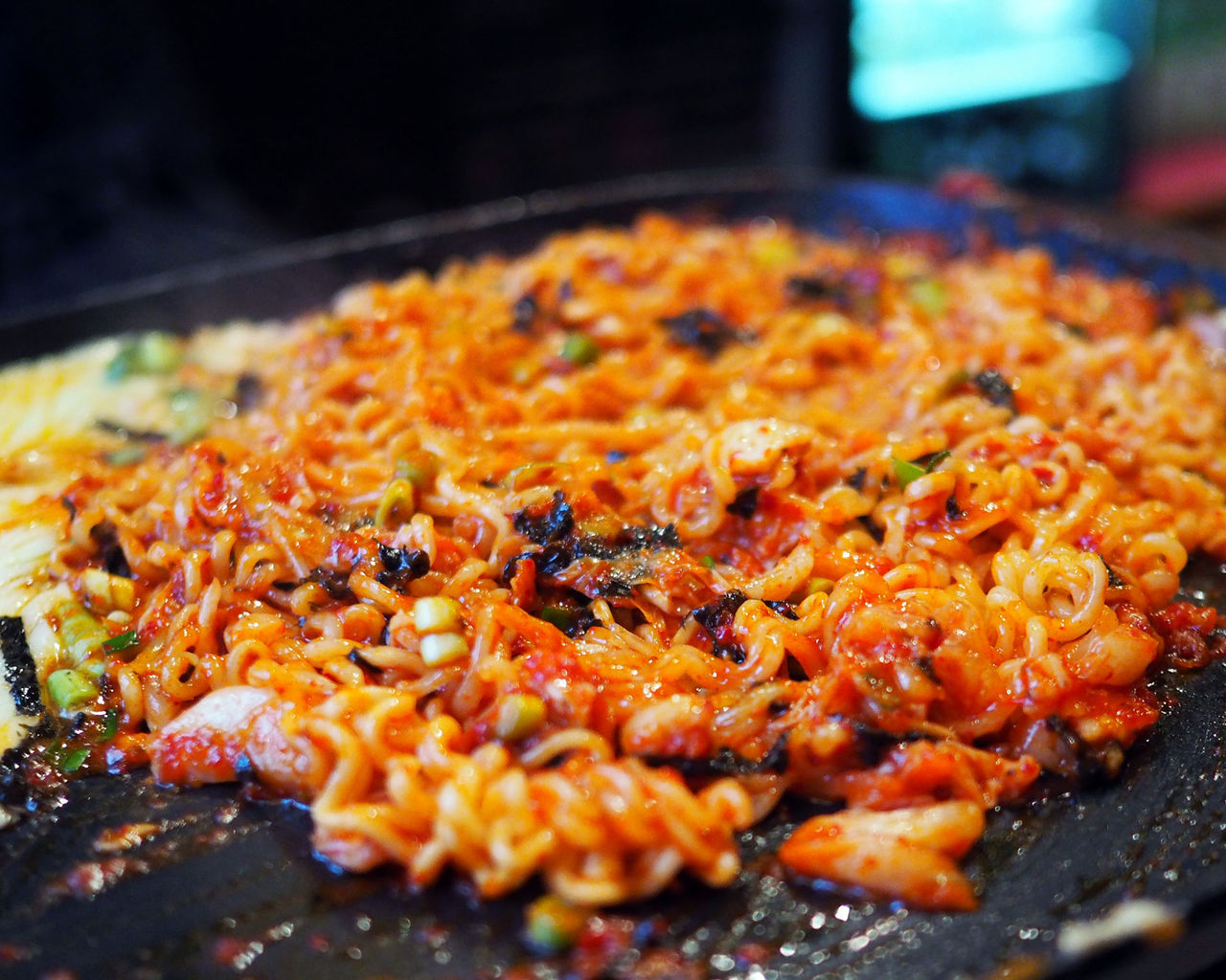 焼かれることでラーメンにヤムニョムがしっかりと絡んで辛味が強くなるのですが、刻んだキムチと荏胡麻の食感や香りでおいしくいただけました