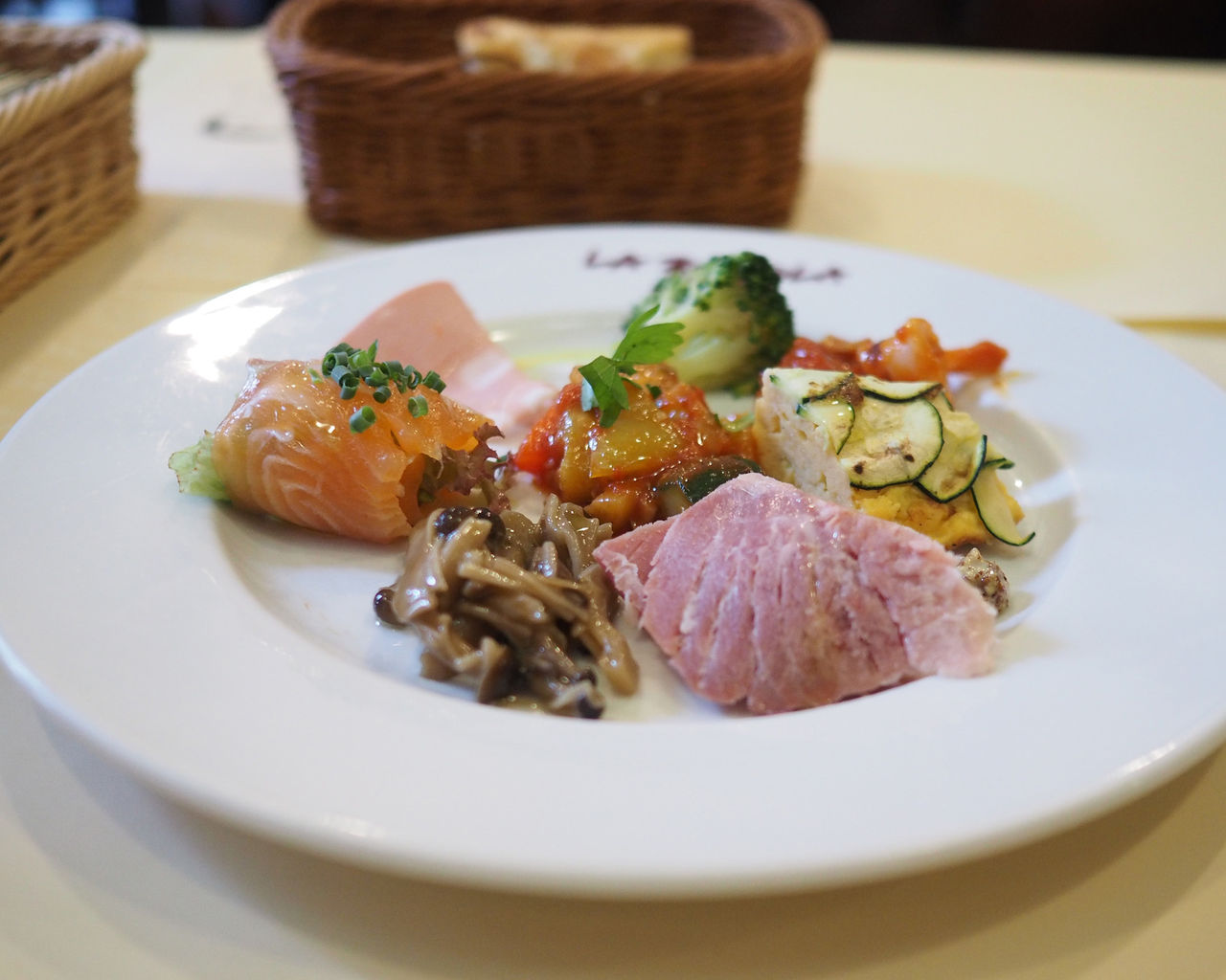 ズッキーニの食感が残された「カポナータ」、 ガーリックの香りとピリッとした辛味が効いた「魚介のアラビアータ」、絶妙な塩味で仕上げられた「豚モモの自家製ハム」 のほか、「ブロッコリーのアリオリアンチョビ炒め」「フリッタータ」「きのこソテー」「サーモン」「ボルタデッカ」と彩りよく盛られているだけでなく、どれもがおいしいものでありました