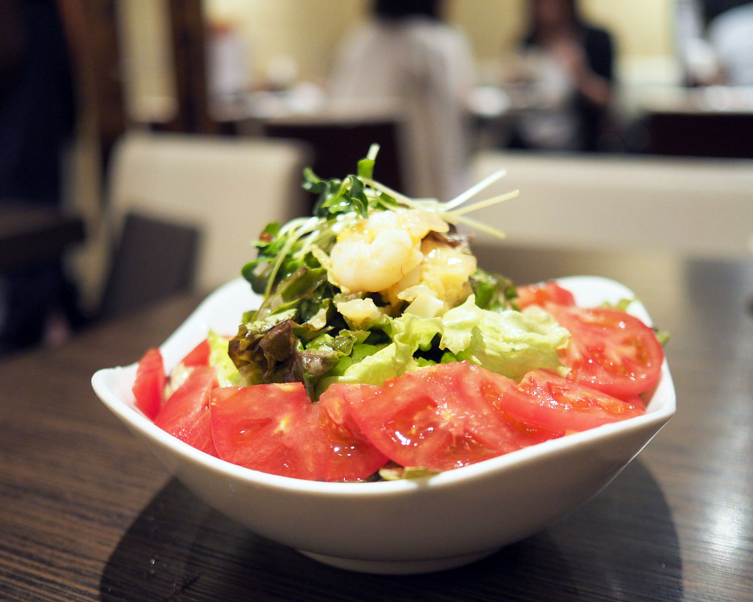 レタスとトマトをメインとしたサラダには海老などの具材もたくさん使われていて、自家製であろう甘みがあるドレッシングでいただけます